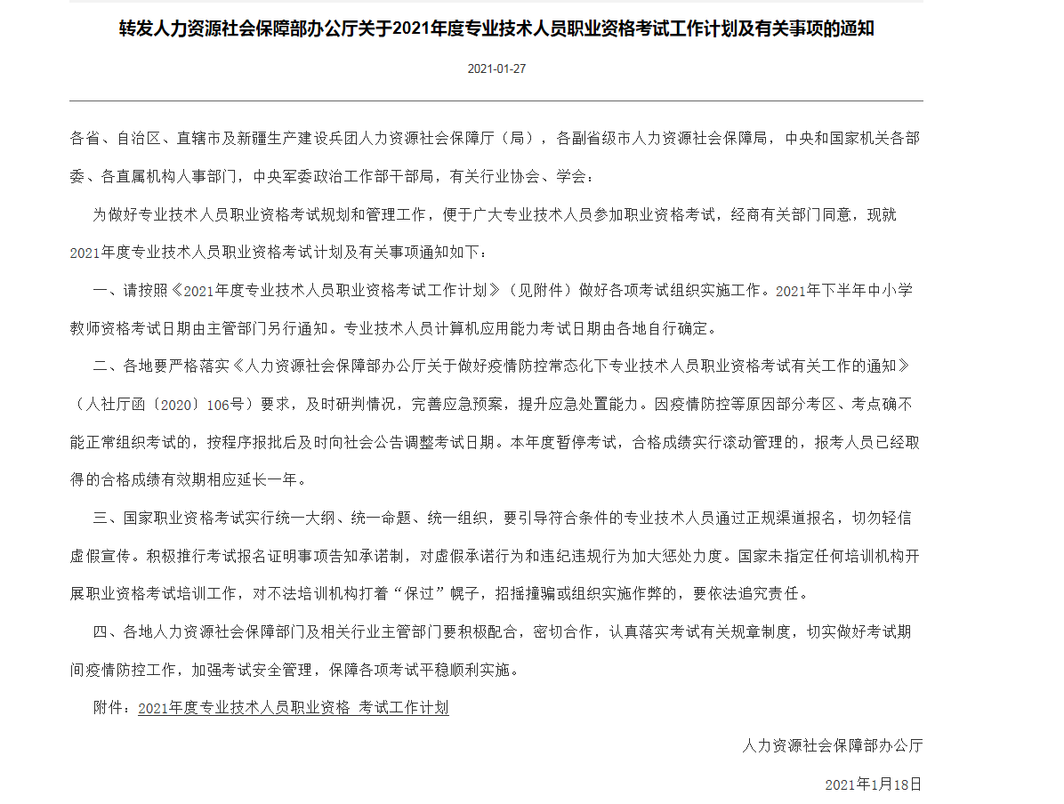 轉(zhuǎn)發(fā)人力資源社會保障部辦公廳關(guān)于2021年度專業(yè)技術(shù)人員職業(yè)資格考試工作計劃及有關(guān)事項的通知